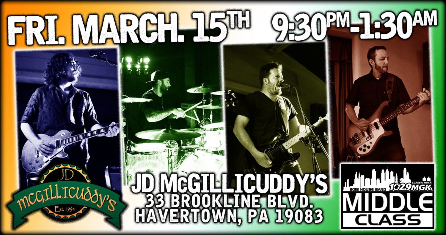 Celebrate St.Patrick’s Day at J.D. McGillicuddy’s in Kirklyn! $5 Cover / Party Starts @12pm Enjoy Our Irish Menu Specials of Ham and Cabbage, Shepherds Pie and All Your Favorites! Live Irish Music performed by Theresa Flanagan and Lefty & Robby . Join us for some St. Patrick’s Day shenanigans! Sláinte!!